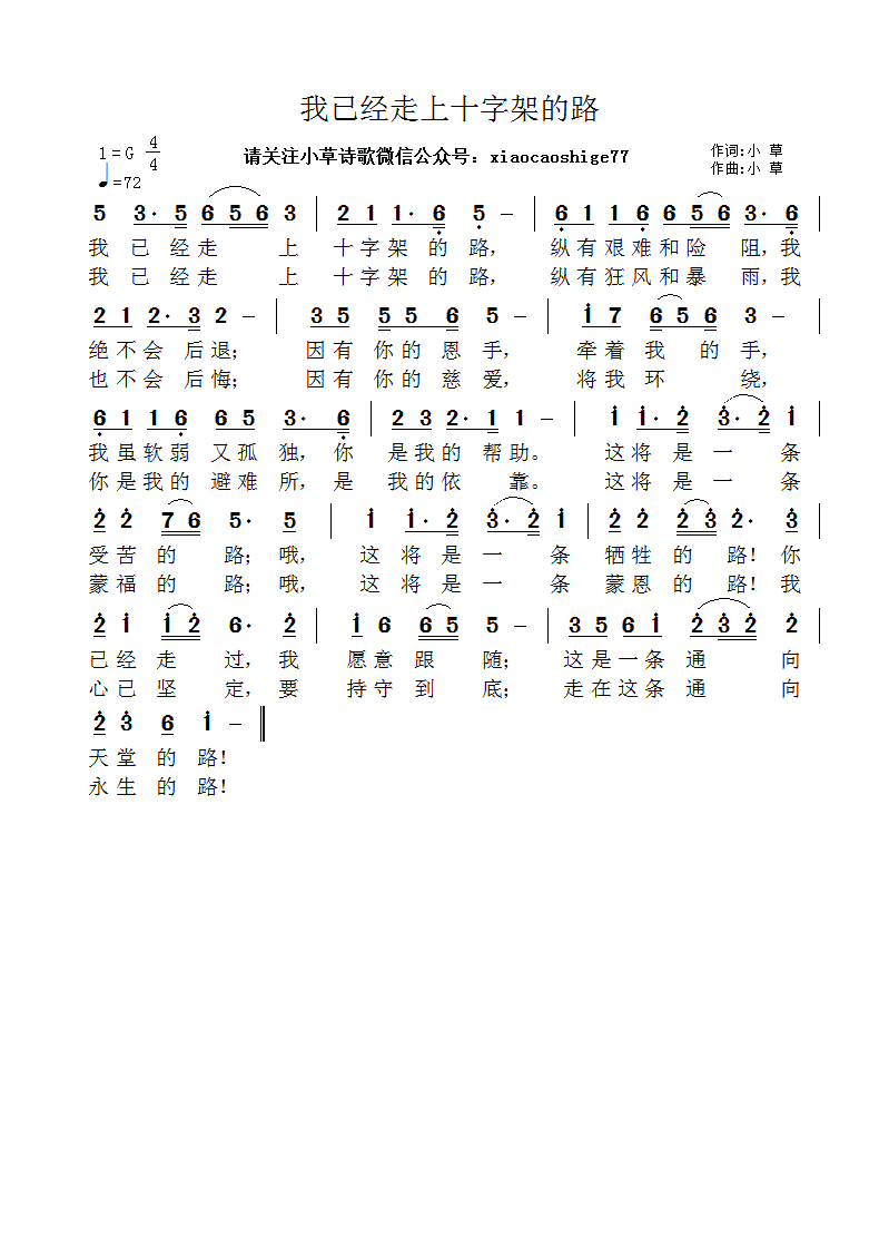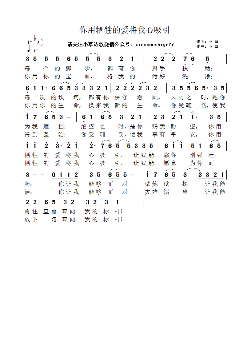你用牺牲的爱将我心吸引,(让我能靠你刚强壮胆,让我能够面对试炼试探,能够面对灾难祸患),我已经走上十字架的路,(我心已坚定,要持守到底,走在这条通向永生的路),直到见你的面
