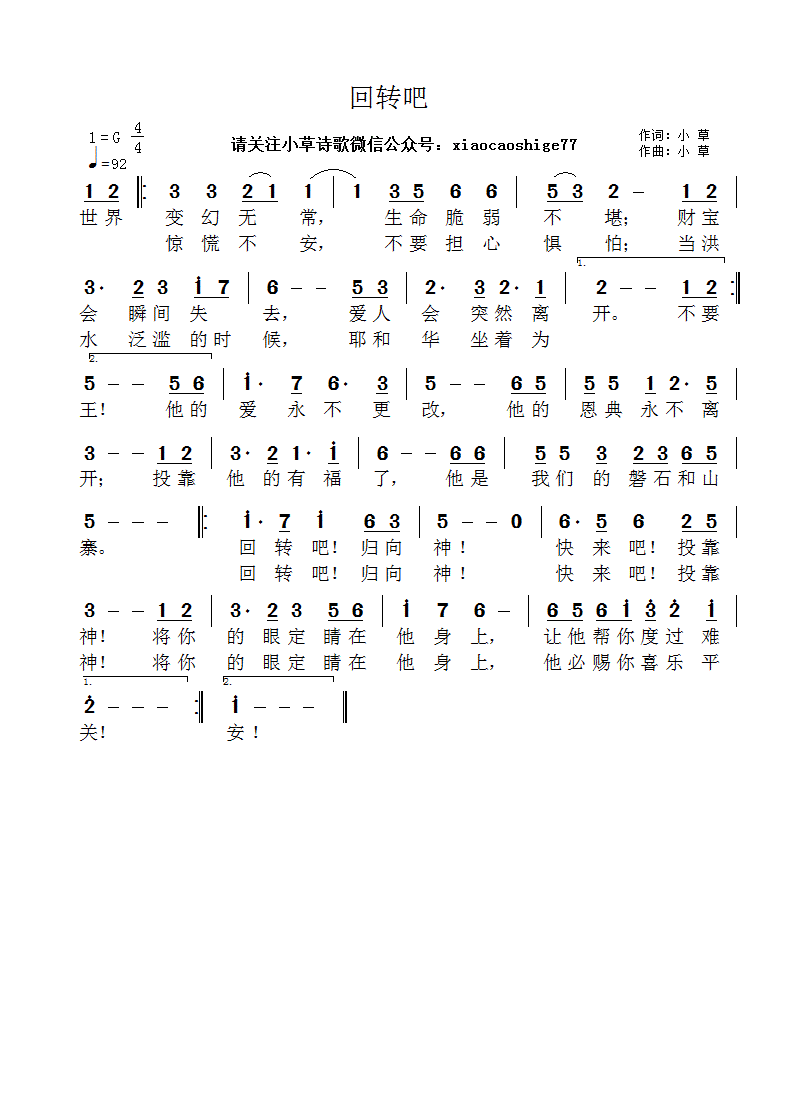 回转吧,(归向神,投靠神!将你的眼定睛在他身上,让他帮你度过难关!他必赐你喜乐平安!我们永远称颂你名我要靠你刚强壮胆)你在旷野开道路你要行事谁能拦阻),我心欢喜(我经过水火也必不致遭害)!